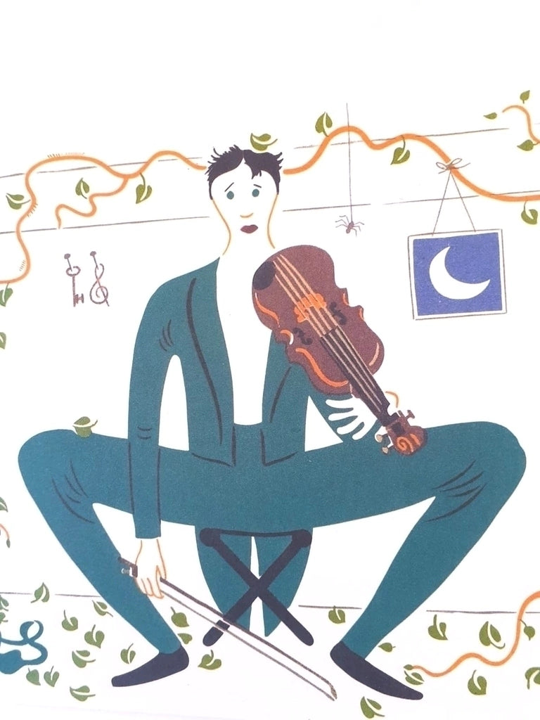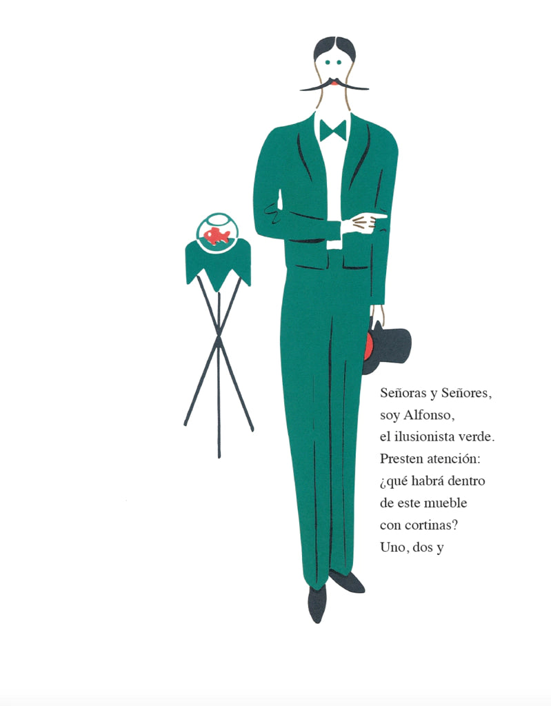 El mago alfonso desaparece y reaparece, a través de sendos trucos, para, finalmente, poder tocar el violín en paz. Otro título de la genial Serie Infantil de 1945 del gran Bruno Munari.* El ilusionista verde es parte de la Serie Infantil de 1945