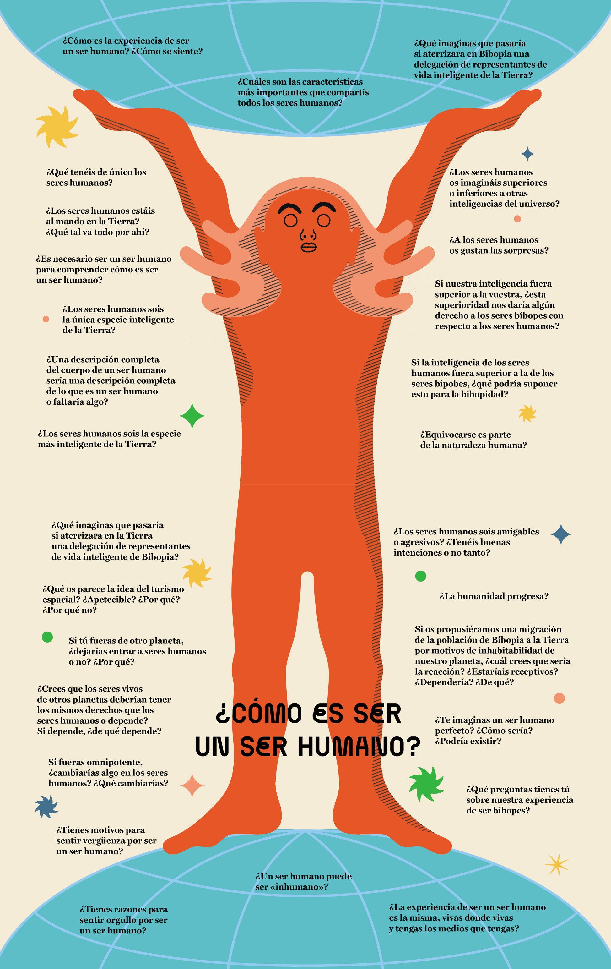 Este atlas filosófico para pararse a pensar, diseñado e ilustrado con una buena dosis de misterio alienígena, se estructura en torno a catorce mapas temáticos que nos invitan a explorar aspectos de nuestra humanidad. ¿Cómo es ser un ser humano? ¿Y cómo es ser tú? ¿Para qué sirve el género? ¿Cómo sabéis lo que sabéis? ¿La Tierra es un buen hogar? ¿Qué tal os lleváis los seres humanos? ¿Quién nombra el mundo en la Tierra? ¿Y, en la Tierra, 2+2 son siempre 4? ¡Y mucho más!
