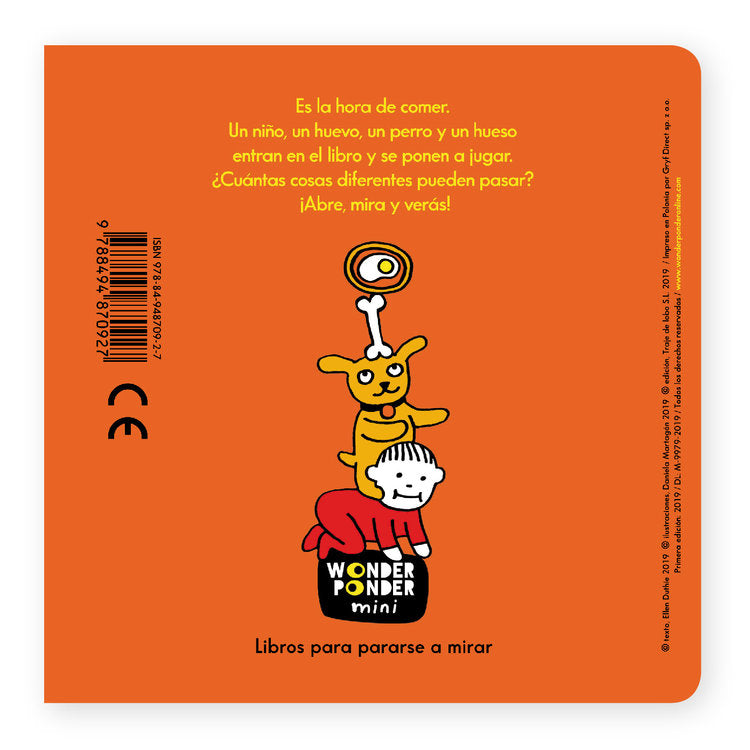 Es la hora de comer. Un niño, un huevo, un perro y un hueso entran en el libro y se ponen a jugar. ¿Cuántas cosas diferentes pueden pasar? ¡Abre, mira y verás! Para prelectores (0-5 años) y mayores juguetones.