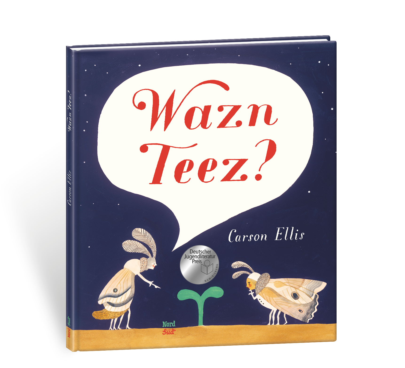 Auf moosigem Grund treffen neugierige Libellen auf chaotische Käfer und ein zartes Pflänzchen. Wazn teez? Was ist das? Und können sie damit ein Baumhaus bauen? Die ausgezeichnete amerikanische Illustratorin Carson Ellis hat in ihrem zweiten Bilderbuch eine zauberhaft fantastische Welt erschaffen, die sie absolut charmant mit einer eigens für dieses Buch entwickelten Kunstsprache untermalt. Der bekannte deutsche Kabarettist und Autor Jess Jochimsen hat, zusammen mit der Kölner Theaterregisseurin Anja Schöne, den Text mit viel Feingefühl und Witz ins Fantasiedeutsche übertragen. Carson Ellis verleiht dem schon in vielen Bilderbüchern thematisierten Kreislauf des Lebens mit seinen sprachbegeisterten Insekten eine vollkommen neue, ausgesprochen fantasie- und liebevolle Nuance, die meisterlich vom Kabarettisten Jess Jochimsen und der Theaterregisseurin und Autorin Anja Schöne in ein zauberhaftes Insektendeutsch übertragen wurde. Maren Bonacker, Süddeutsche Zeitung Ein wundervoll verträumtes Gesamtkunstwerk. Alice Werner, NZZ Ein Insekten-Esperanto, das bisher keiner kannte und das doch für alle verständlich ist. Himbeer – Berlin mit Kind Nominiert für den Deutschen Jugendliteraturpreis 2018, Kategorie Bilderbuch, 2018 Beste 7, Februar 2017